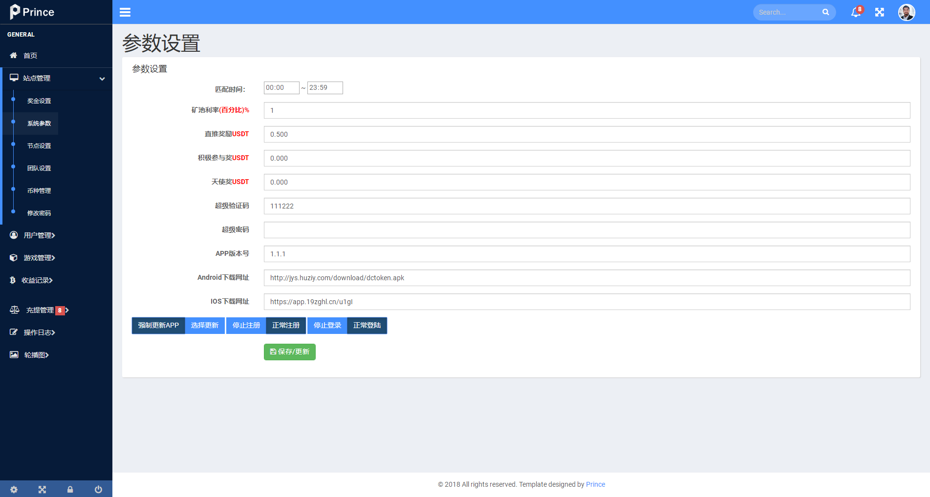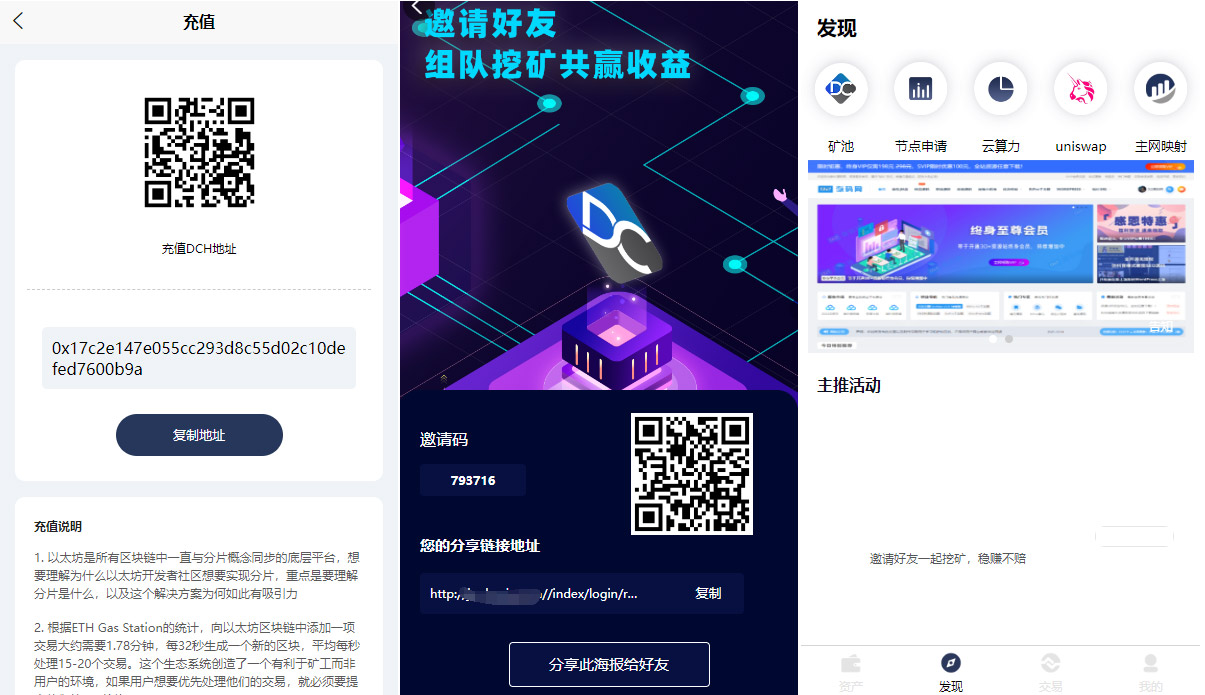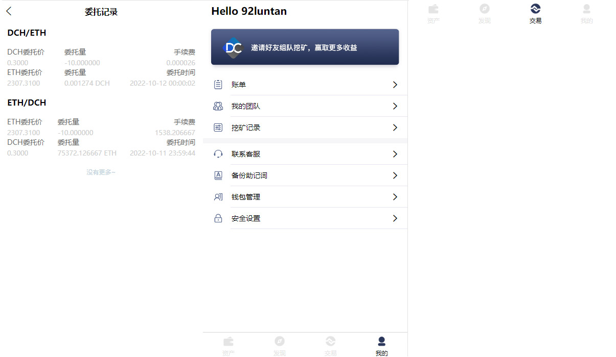 页面包含个人的分享邀请好友、矿池、币币交易、拼团游戏,等功能。