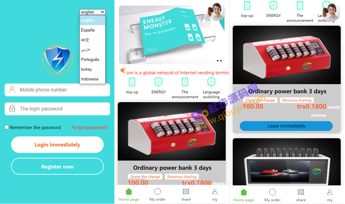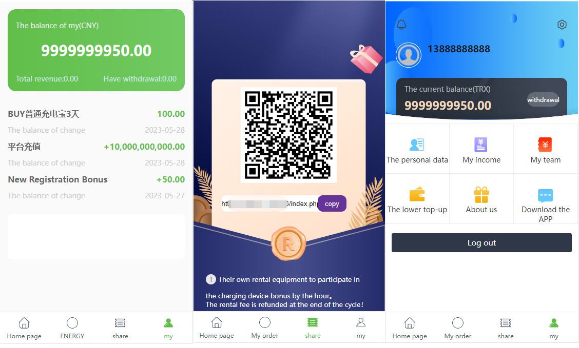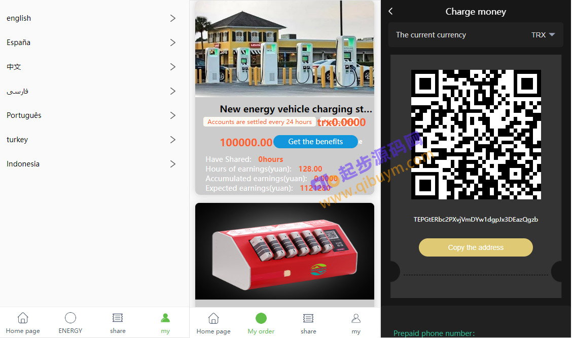 一款以前的充电宝投资系统二开的,前端新增6种语言,支持TRX充值
