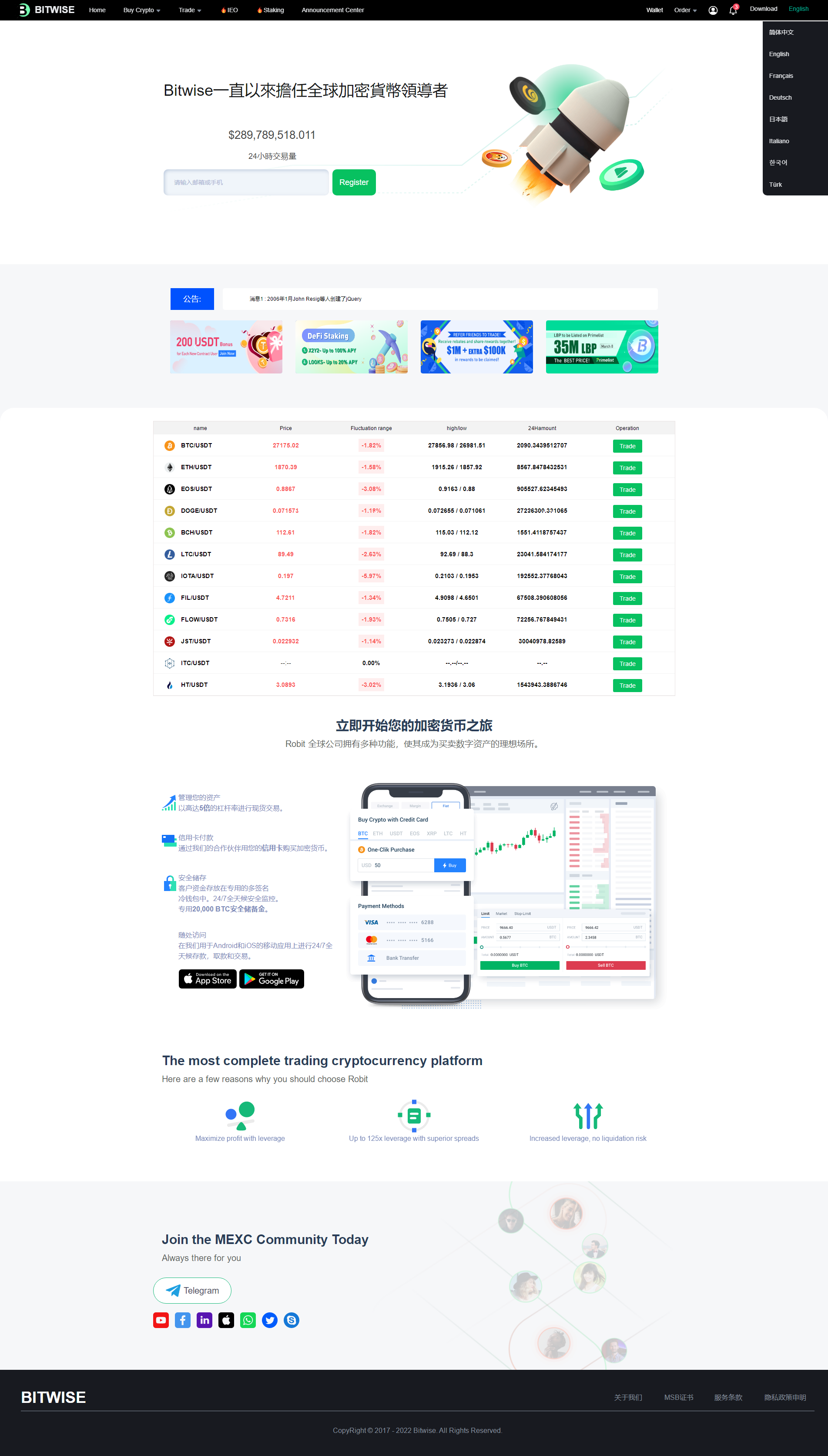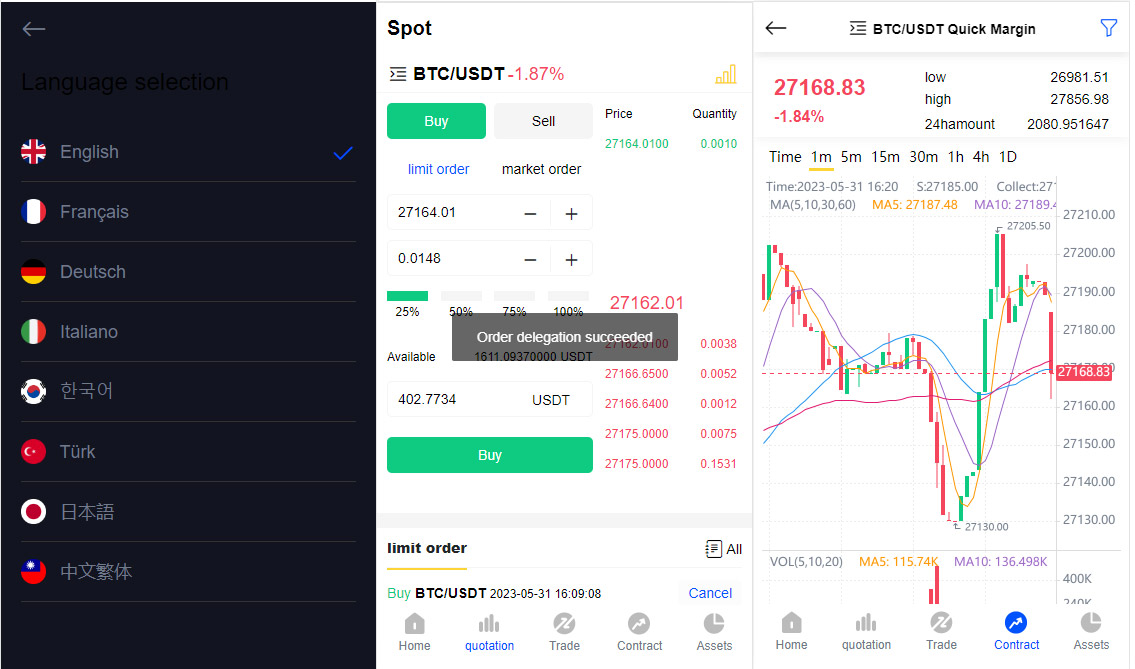 修复K线失效问题,系统8种语言,支持币币合约交易、新币申购、智能挖矿等功能