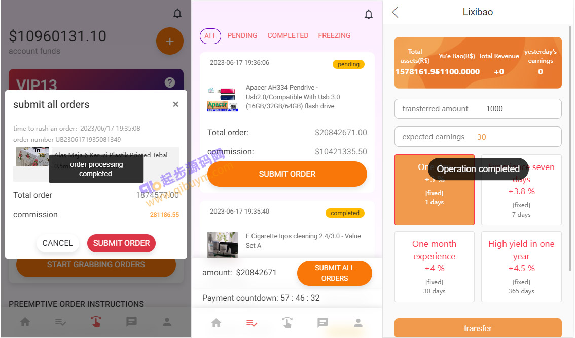 系统增加打针/叠加组设置,后台釆取全新框架,余额宝分为定数时间,一天,七天,一个月,一年,合约到就会产生收益
