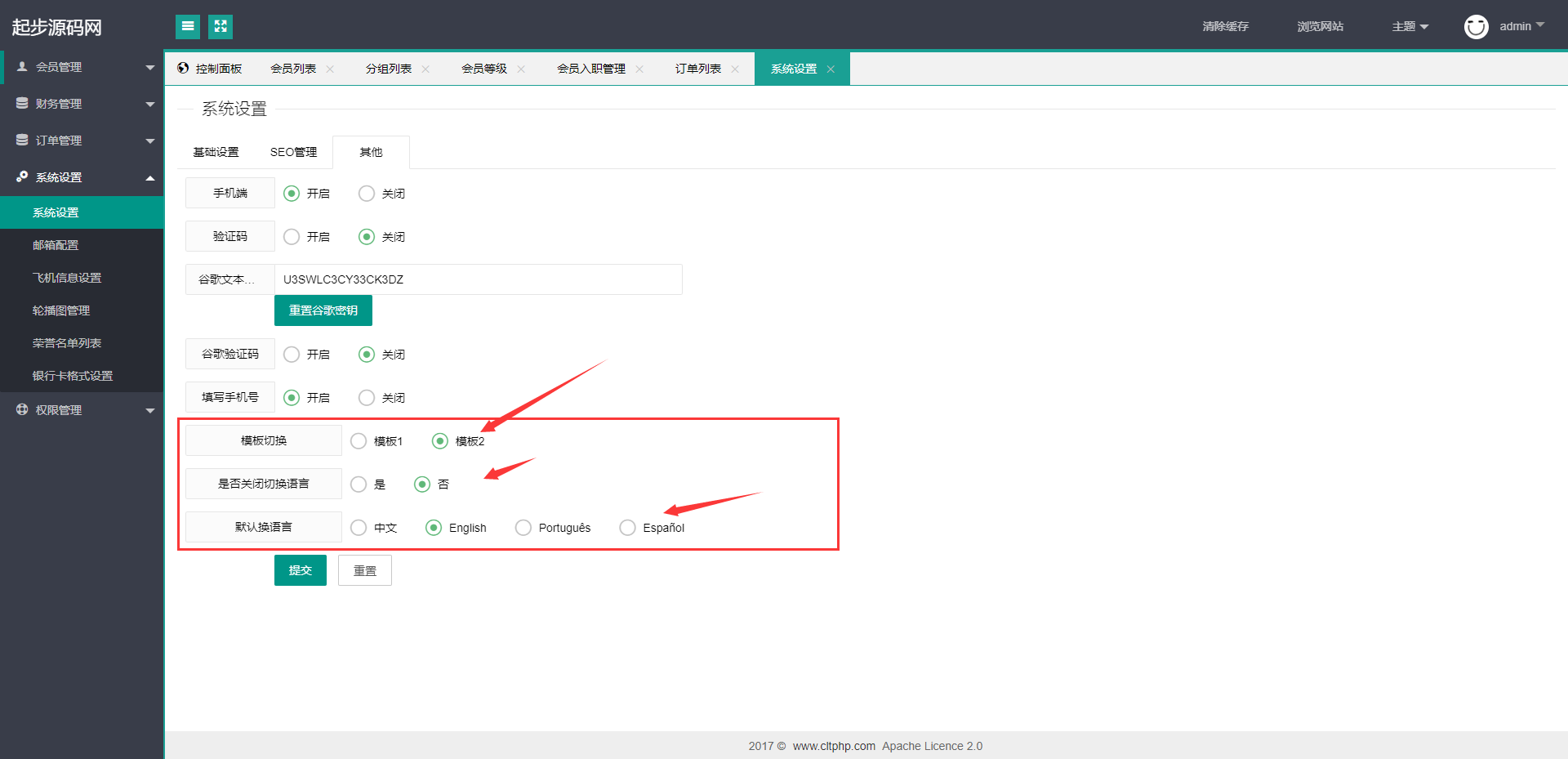 前端双套UI支持后台支持设置默认语言和关闭前端语言选择开关,多语言支持切换设置默认语言(源码里附带多个语言包需要自己设置)