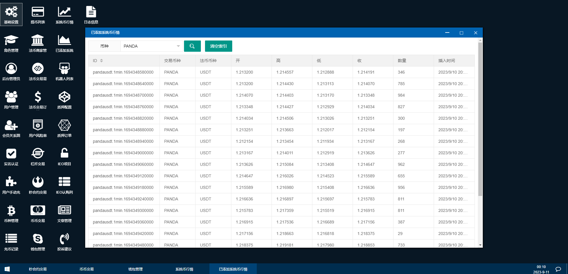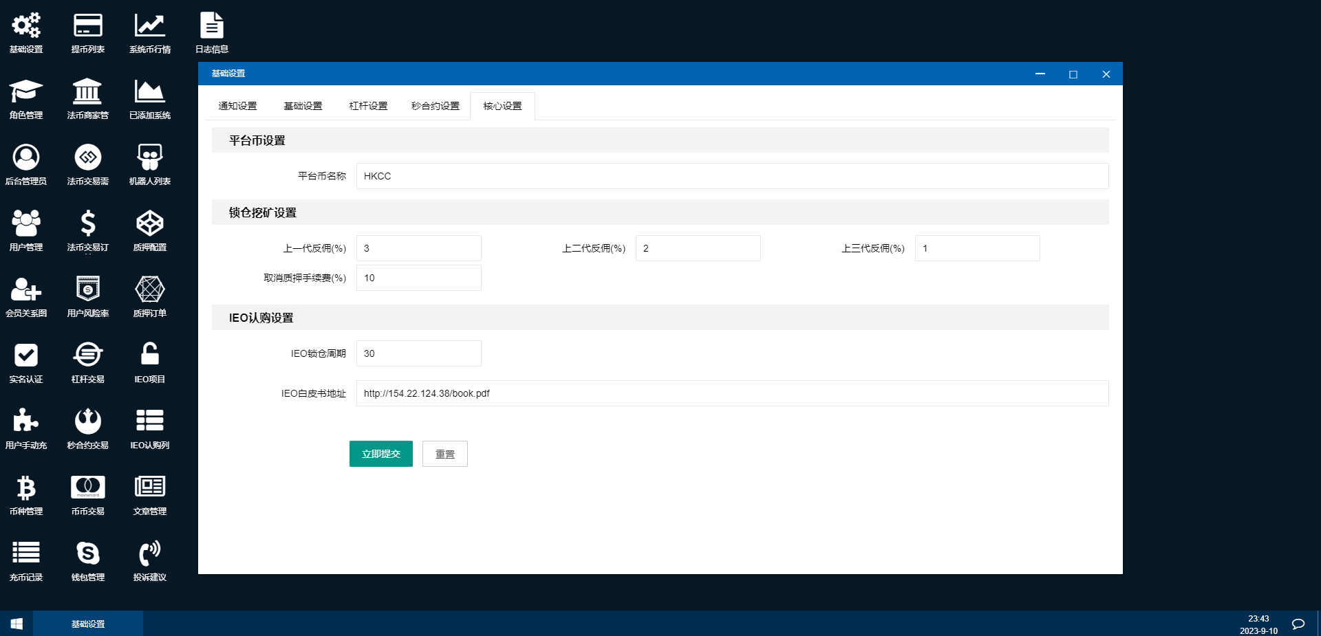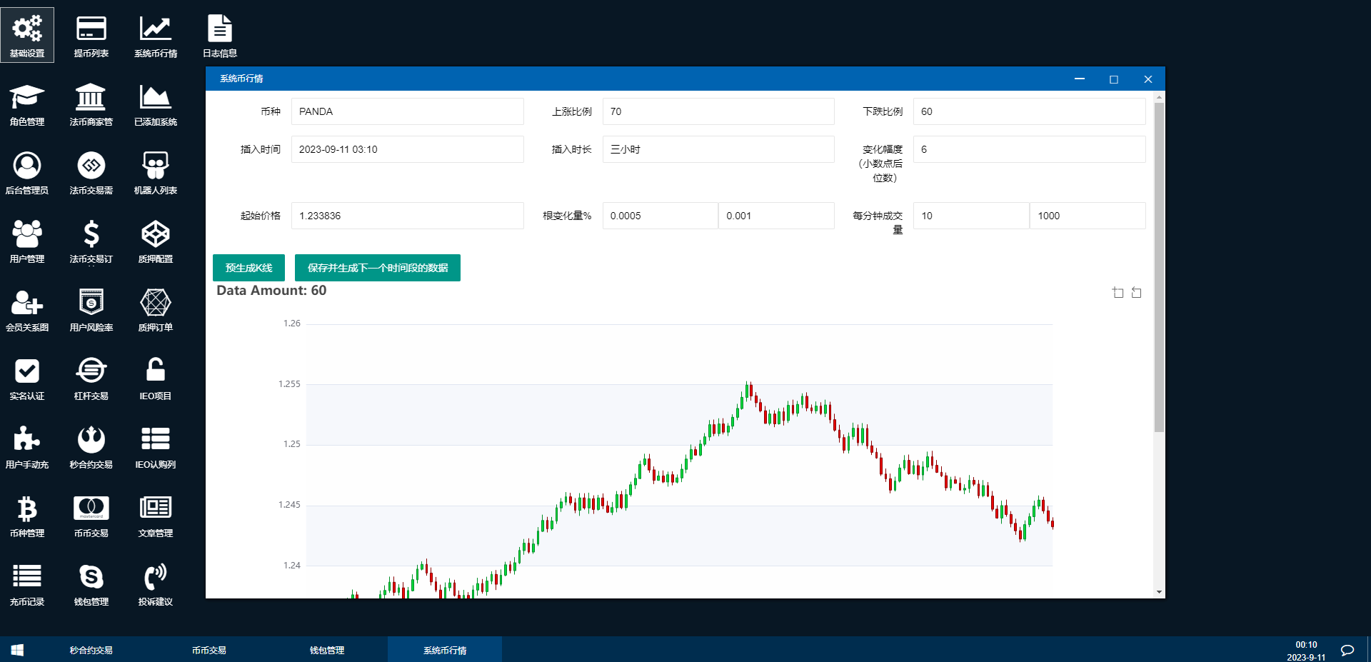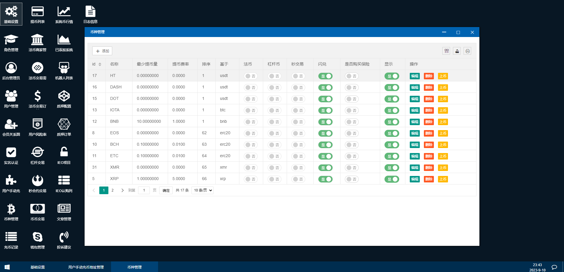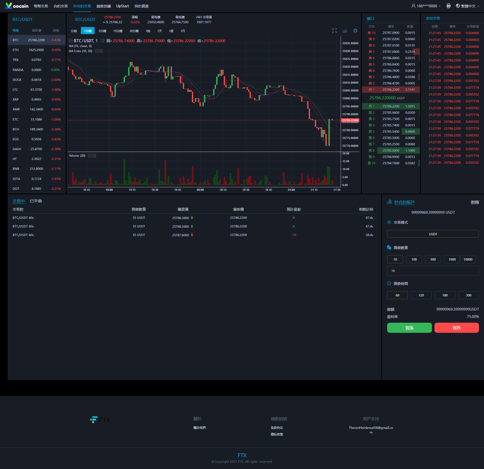 币币交易、合约交易、秒合约交易、锁仓质押、IEO认购、平台币预生成K线(完整机器人),另新增了后台设置充币地址等新功能