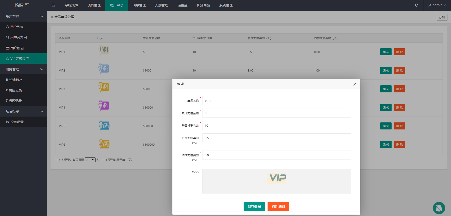 VIP等级划分,可根据不同等级,设置不同的百分比奖励