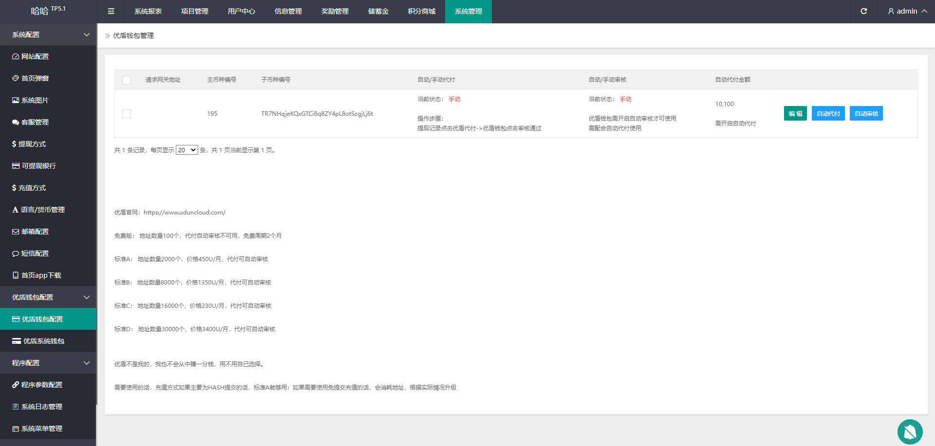 收付款对接了优盾钱包,可实现USDT自动充提,具体价格请自行查看优盾官网,没有合作,用不用请自己选择哦