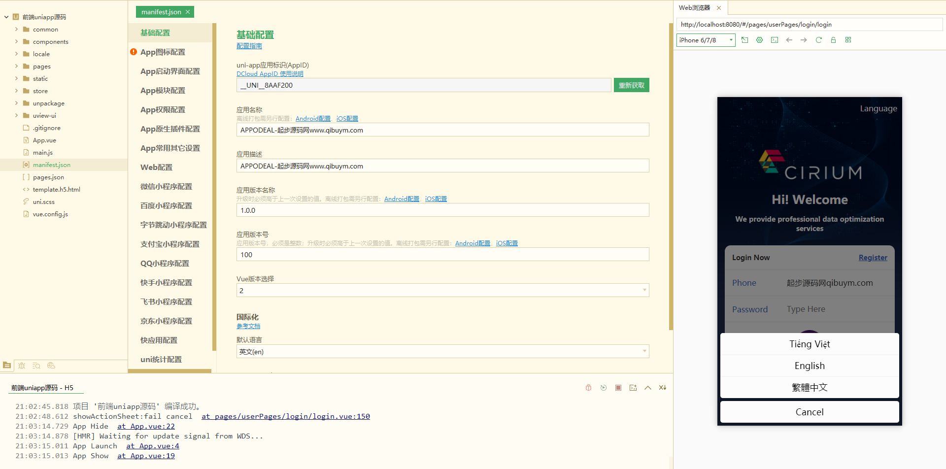 前端uinapp开发带源码,带多语言默认越南语被屏蔽了(可去uniapp自行开启),后端thinkphp框架源码全开源