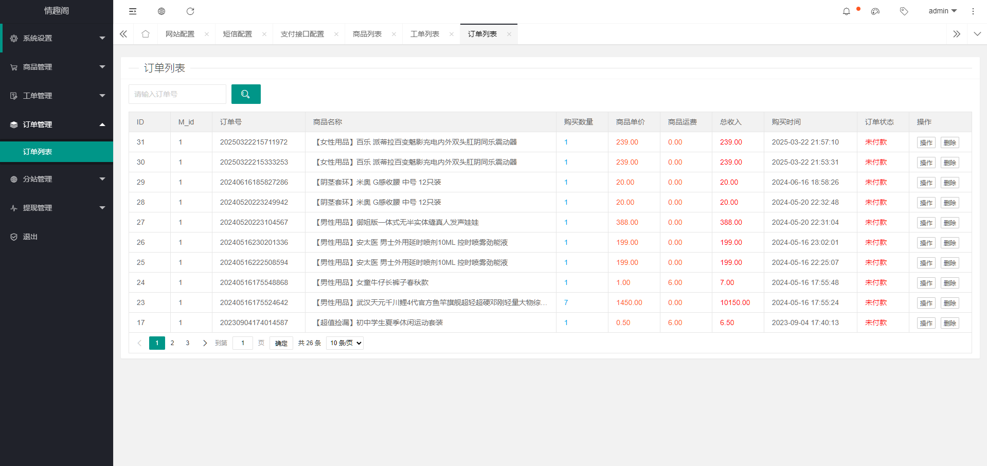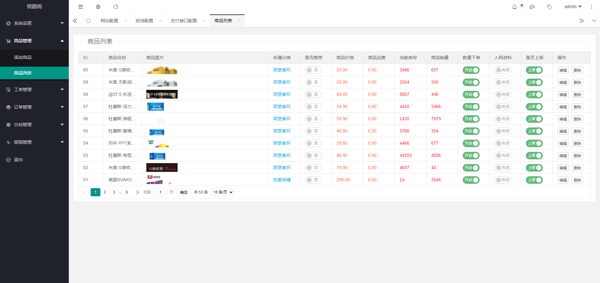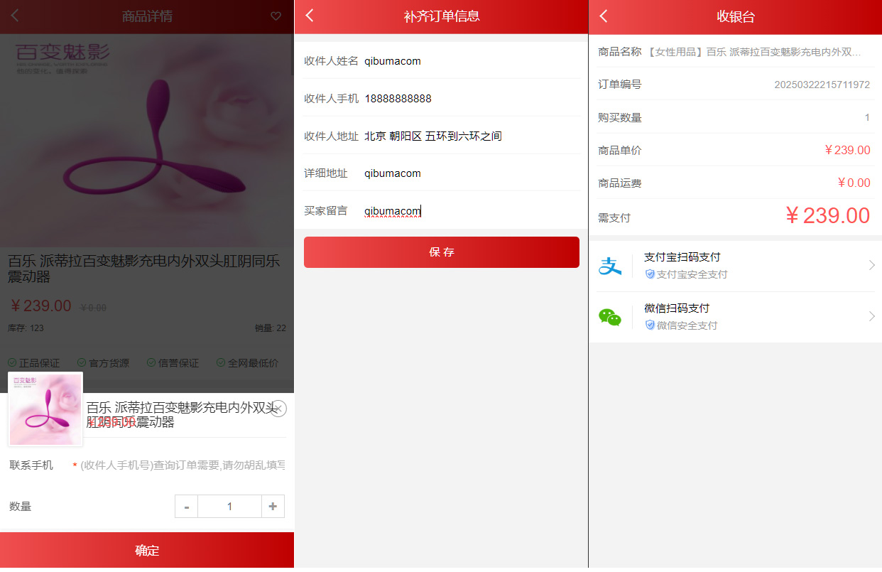 一款开源的免登入免注册的性用品商城系统源码,商城是全开源的,支持分站模式,支持发展分站代理,不需要注册直接就可以在线下单,使用的是免签的易支付,易支付随便自己接入任何平台,用户付款之后可以自己查询物流信息,对接的是阿里的物流系统,有需要的可以下载学习研究!!!